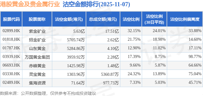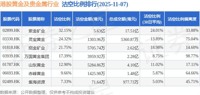 从沽空比例来看,紫金矿业、灵宝黄金、招金矿业沽空比例位居行业前三,分别为32.15%、24.32%、21.75%。