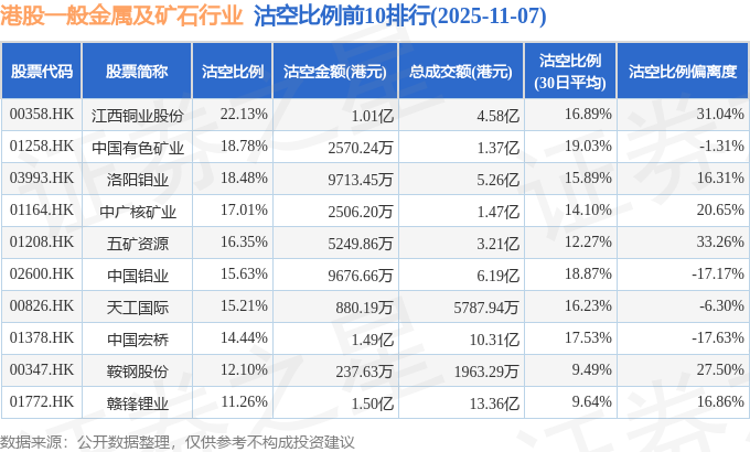 从沽空比例来看,江西铜业股份、中国有色矿业、洛阳钼业沽空比例位居行业前三,分别为22.13%、18.78%、18.48%。
