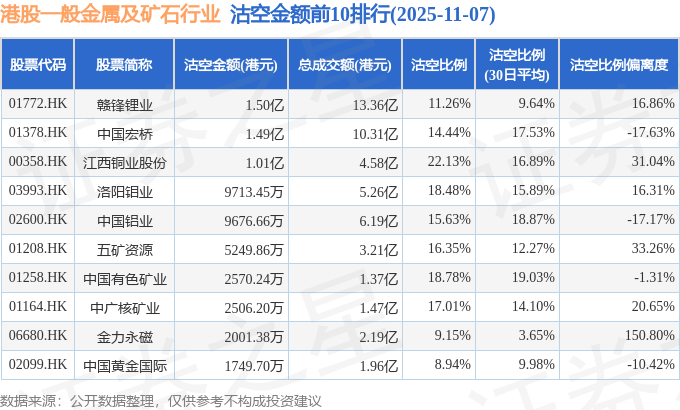 从沽空金额来看,赣锋锂业、中国宏桥、江西铜业股份沽空金额位居行业前三,分别为1.5亿港元、1.49亿港元、1.01亿港元。