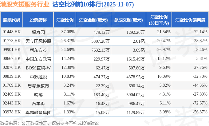 从沽空金额来看,新东方-S、天立国际控股、福寿园沽空金额位居行业前三,分别为7632.13万港元、5307.28万港元、479.12万港元。