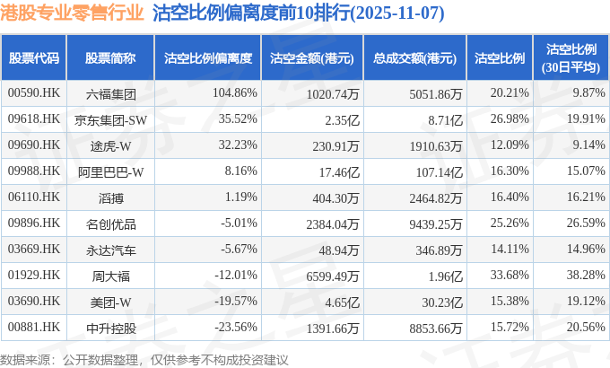 从沽空比例偏离度来看,六福集团、京东集团-SW、途虎-W沽空比例偏离度位居行业前三,分别为104.86%、35.52%、32.23%。