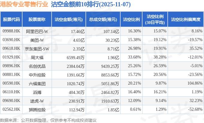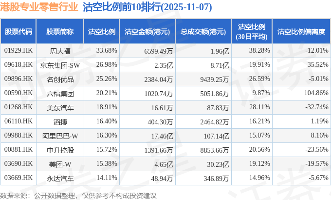 从沽空比例来看,周大福、京东集团-SW、名创优品沽空比例位居行业前三,分别为33.68%、26.98%、25.26%。
