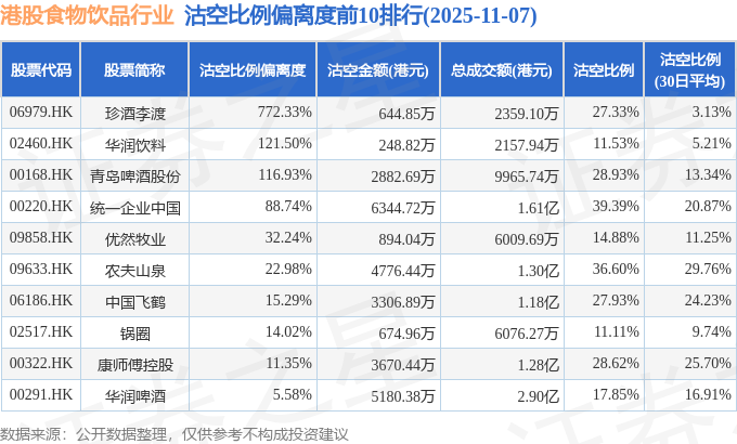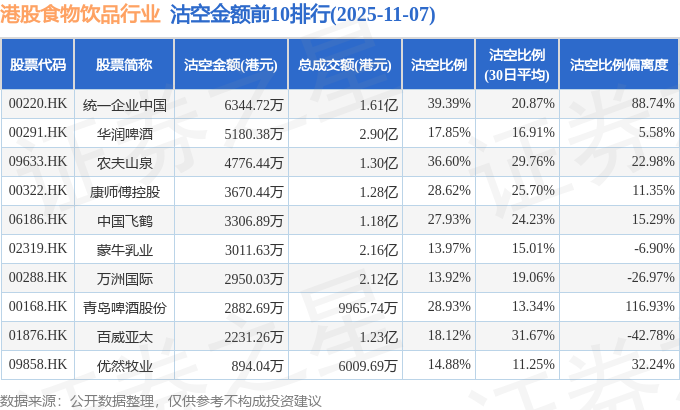 从沽空金额来看,统一企业中国、华润啤酒、农夫山泉沽空金额位居行业前三,分别为6344.72万港元、5180.38万港元、4776.44万港元。