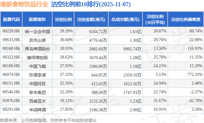从沽空比例来看,统一企业中国、农夫山泉、青岛啤酒股份沽空比例位居行业前三,分别为39.39%、36.6%、28.93%。