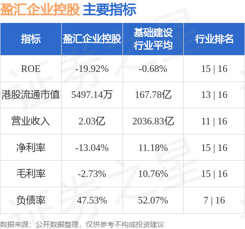 盈汇企业控股港股市值5497.14万港元,在基础建设行业中排名第13。主要指标见下表: