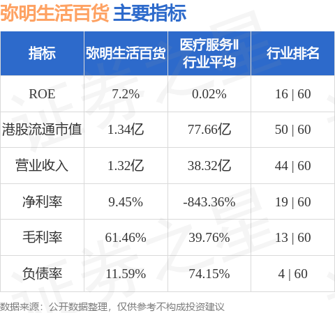 弥明生活百货港股市值1.34亿港元,在医疗服务Ⅱ行业中排名第50。主要指标见下表: