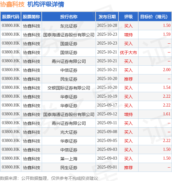 截至2025年11月7日收盘,协鑫科技(03800.HK)报收于1.47港元,上涨6.52%,成交量18.99亿股,成交额27.36亿港元。投行对该股的评级以买入为主,近90天内共有12家投行给出买入评级,近90天的目标均价为1.79港元。东北证券最新一份研报给予协鑫科技买入评级,目标价1.5港元。