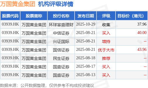 投行对该股的评级以买入为主,近90天内共有3家投行给出买入评级,近90天的目标均价为40.64港元。环球富盛理财最新一份研报给予万国黄金集团收集评级,目标价37.96港元。