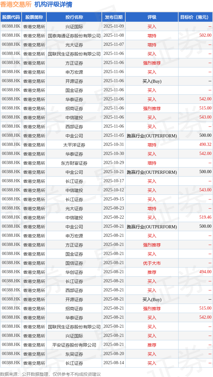 投行对该股的评级以买入为主,近90天内共有21家投行给出买入评级,近90天的目标均价为517.7港元。兴证国际最新一份研报给予香港交易所买入评级。