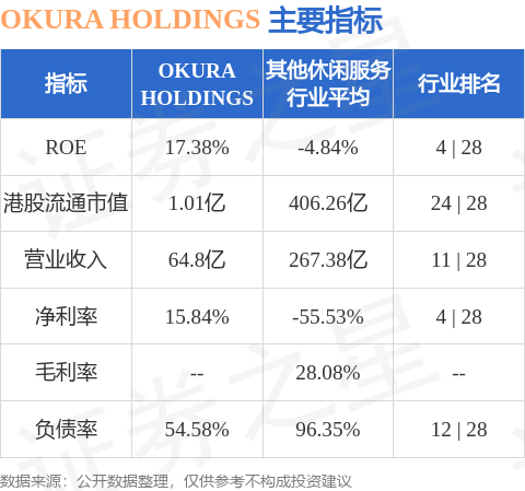 OKURA HOLDINGS港股市值1.01亿港元,在其他休闲服务行业中排名第24。主要指标见下表: