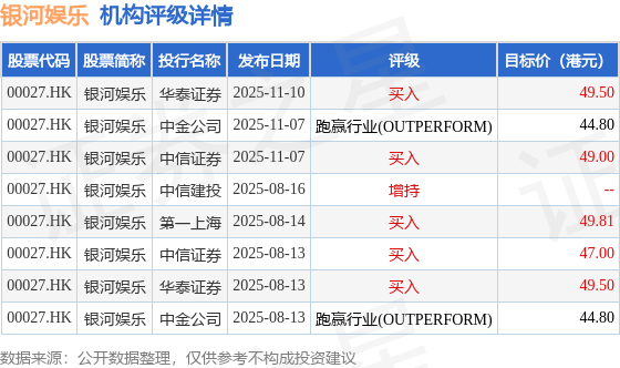 截至2025年11月10日收盘,银河娱乐(00027.HK)报收于40.24港元,上涨3.76%,成交量1747.5万股,成交额6.93亿港元。投行对该股的评级以买入为主,近90天内共有5家投行给出买入评级,近90天的目标均价为47.77港元。华泰证券最新一份研报给予银河娱乐买入评级,目标价49.5港元。