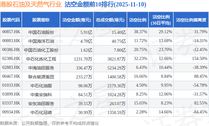 从沽空金额来看,中国石油股份、中国海洋石油、中国石油化工股份沽空金额位居行业前三,分别为5.91亿港元、4.78亿港元、1.62亿港元。