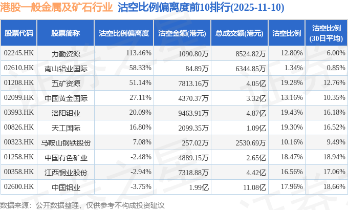 从沽空比例偏离度来看,力勤资源、南山铝业国际、五矿资源沽空比例偏离度位居行业前三,分别为113.46%、58.33%、51.14%。