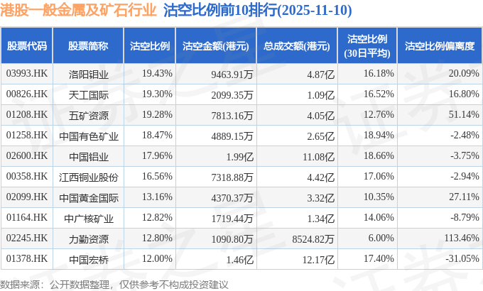 从沽空比例来看,洛阳钼业、天工国际、五矿资源沽空比例位居行业前三,分别为19.43%、19.3%、19.28%。