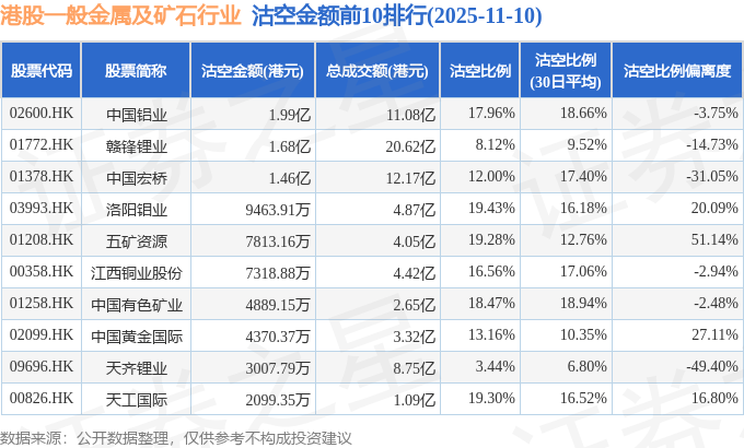从沽空金额来看,中国铝业、赣锋锂业、中国宏桥沽空金额位居行业前三,分别为1.99亿港元、1.68亿港元、1.46亿港元。