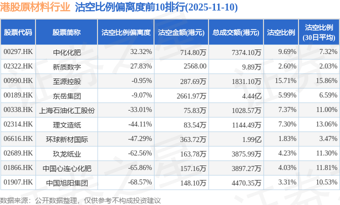 从沽空比例偏离度来看,中化化肥、新质数字、至源控股沽空比例偏离度位居行业前三,分别为32.32%、27.83%、-0.95%。