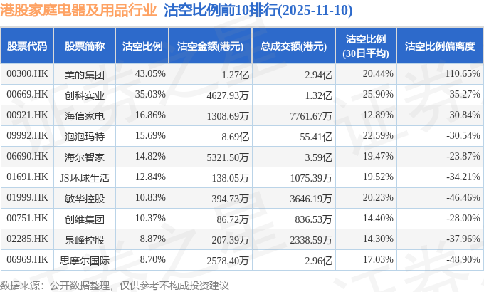 从沽空比例来看,美的集团、创科实业、海信家电沽空比例位居行业前三,分别为43.05%、35.03%、16.86%。