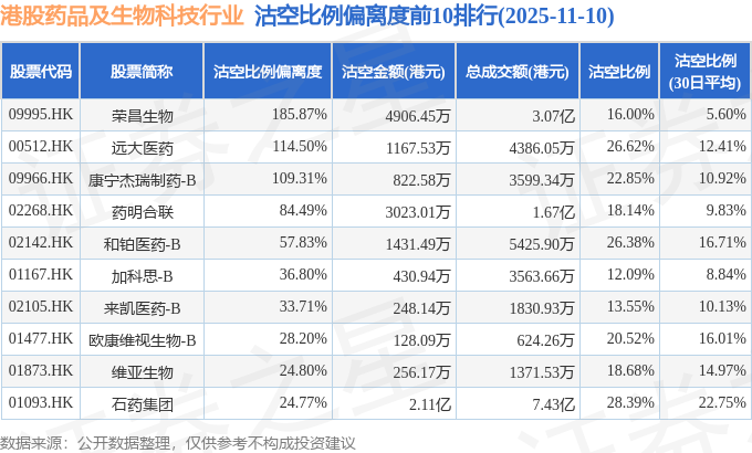 从沽空比例偏离度来看,荣昌生物、远大医药、康宁杰瑞制药-B沽空比例偏离度位居行业前三,分别为185.87%、114.5%、109.31%。
