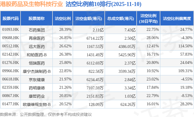 由于港股人民币柜台交易股票成交金额较小,沽空比例普遍偏高,为了避免干扰,已将人民币柜台交易股票从排行表格中剔除。
