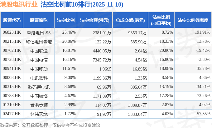 从沽空比例来看,香港电讯-SS、和记电讯香港、中国联通沽空比例位居行业前三,分别为25.46%、20.86%、16.81%。