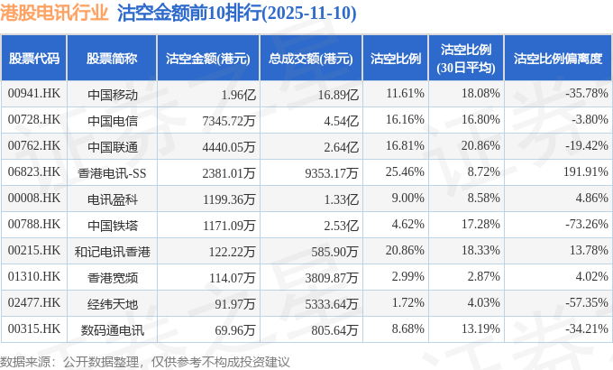 从沽空金额来看,中国移动、中国电信、中国联通沽空金额位居行业前三,分别为1.96亿港元、7345.72万港元、4440.05万港元。