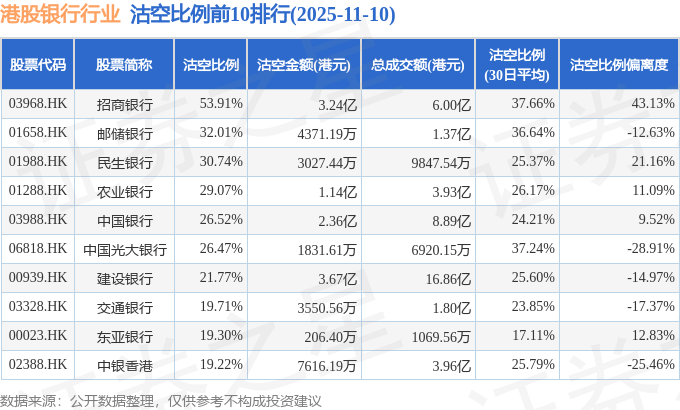 从沽空金额来看,建设银行、招商银行、工商银行沽空金额位居行业前三,分别为3.67亿港元、3.24亿港元、3.04亿港元。