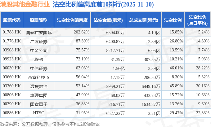 从沽空比例偏离度来看,国泰君安国际、广发证券、中金公司沽空比例偏离度位居行业前三,分别为202.62%、87.39%、75.57%。