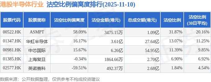 从沽空金额来看,中芯国际、华虹半导体、ASMPT沽空金额位居行业前三,分别为6.26亿港元、3.61亿港元、3475.15万港元。
