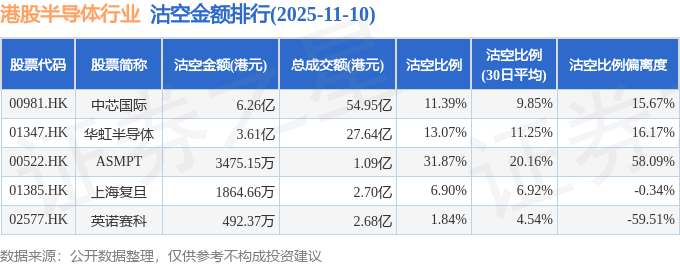 从沽空比例来看,ASMPT、华虹半导体、中芯国际沽空比例位居行业前三,分别为31.87%、13.07%、11.39%。