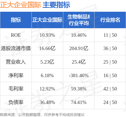 正大企业国际港股市值16.66亿港元,在生物制品Ⅱ行业中排名第36。主要指标见下表: