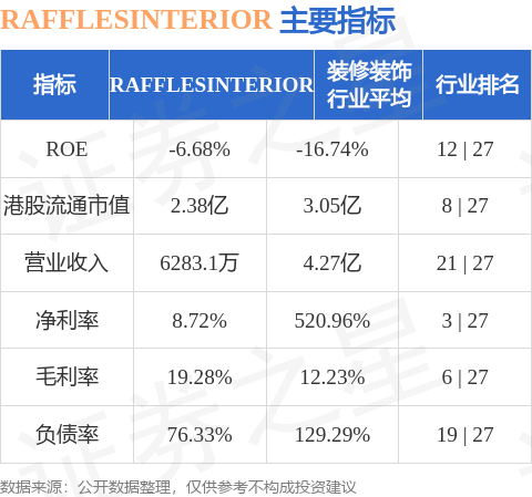 RAFFLESINTERIOR港股市值2.38亿港元,在装修装饰行业中排名第8。主要指标见下表: