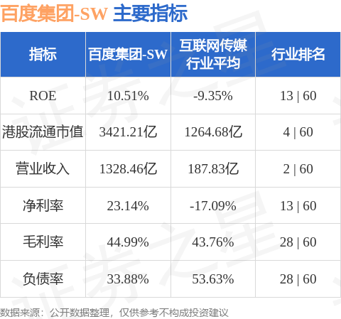 百度集团-SW港股市值3421.21亿港元,在互联网传媒行业中排名第4。主要指标见下表: