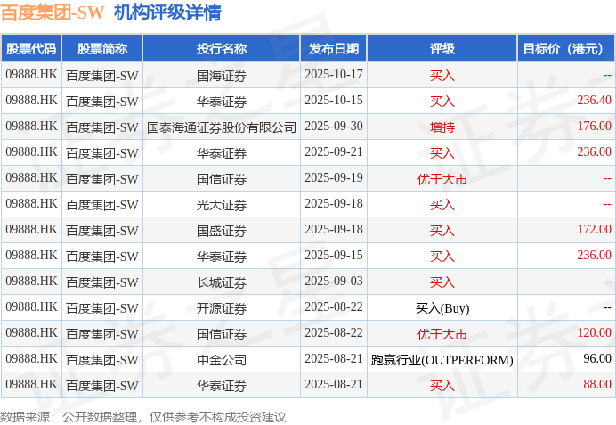投行对该股的评级以买入为主,近90天内共有8家投行给出买入评级,近90天的目标均价为170.05港元。国海证券最新一份研报给予百度集团-SW买入评级。