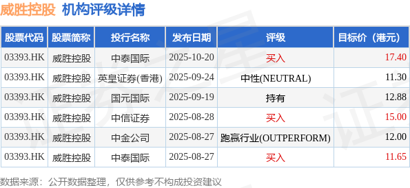 投行对该股的评级以买入为主,近90天内共有3家投行给出买入评级,近90天的目标均价为13.37港元。中泰国际最新一份研报给予威胜控股买入评级,目标价17.4港元。