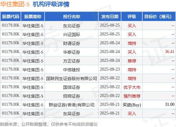 投行对该股的评级以买入为主,近90天内共有4家投行给出买入评级,近90天的目标均价为33.7港元。东北证券最新一份研报给予华住集团-S买入评级。