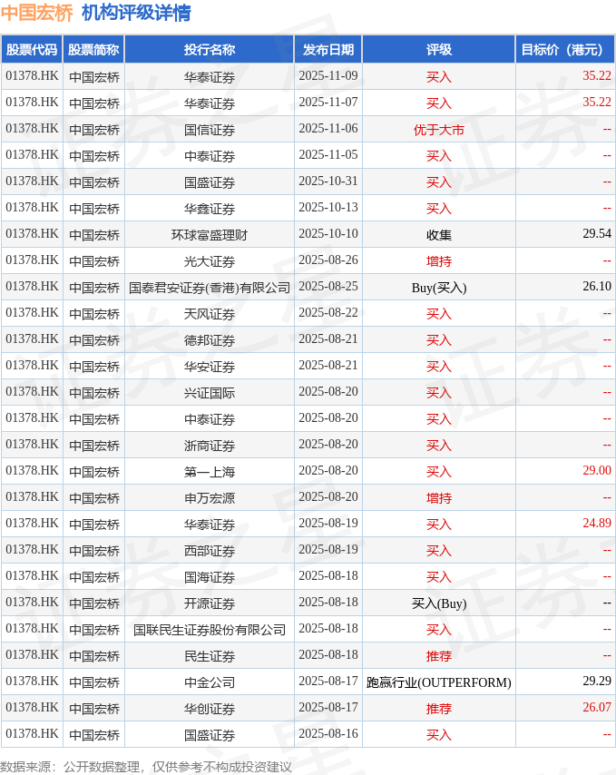 截至2025年11月11日收盘,中国宏桥(01378.HK)报收于32.4港元,上涨1.5%,成交量2868.07万股,成交额9.26亿港元。投行对该股的评级以买入为主,近90天内共有17家投行给出买入评级,近90天的目标均价为29.42港元。华泰证券最新一份研报给予中国宏桥买入评级,目标价35.22港元。