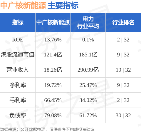 中广核新能源港股市值121.4亿港元,在电力行业中排名第9。主要指标见下表: