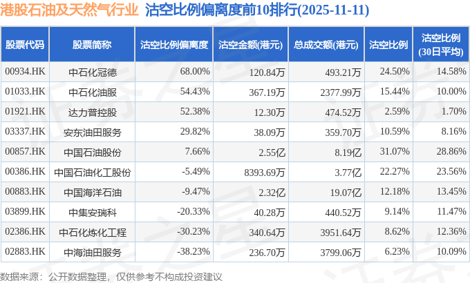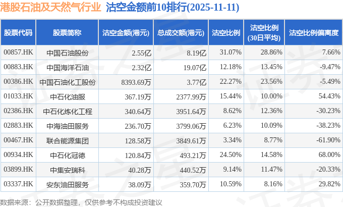 从沽空金额来看,中国石油股份、中国海洋石油、中国石油化工股份沽空金额位居行业前三,分别为2.55亿港元、2.32亿港元、8393.69万港元。