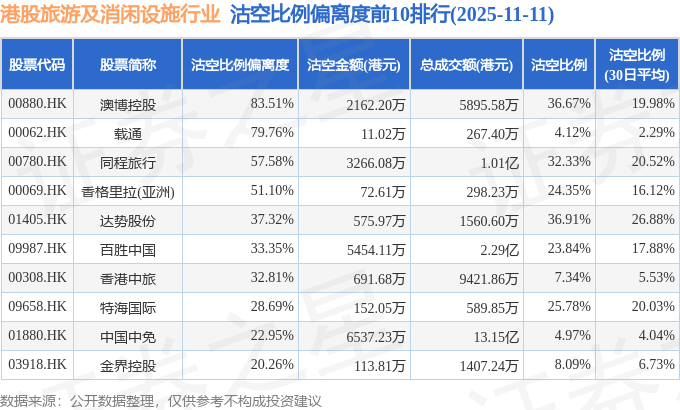 由于港股人民币柜台交易股票成交金额较小,沽空比例普遍偏高,为了避免干扰,已将人民币柜台交易股票从排行表格中剔除。