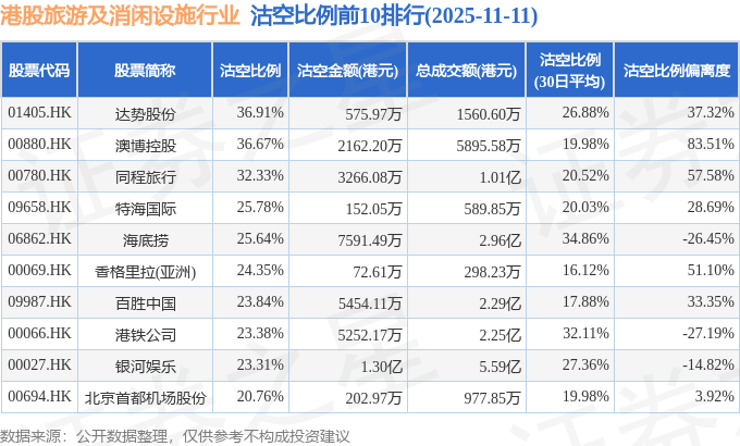 从沽空比例来看,达势股份、澳博控股、同程旅行沽空比例位居行业前三,分别为36.91%、36.67%、32.33%。