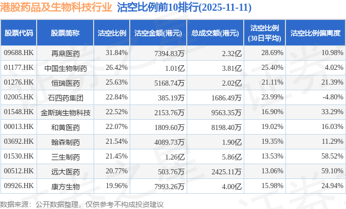 从沽空比例来看,再鼎医药、中国生物制药、恒瑞医药沽空比例位居行业前三,分别为31.84%、26.42%、25.63%。