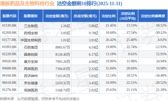 从沽空金额来看,三生制药、药明生物、中国生物制药沽空金额位居行业前三,分别为1.26亿港元、1.05亿港元、1.01亿港元。