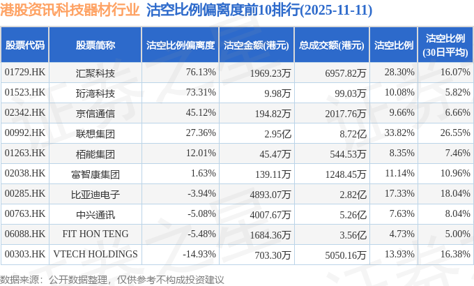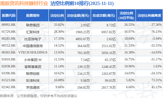 从沽空比例来看,联想集团、汇聚科技、比亚迪电子沽空比例位居行业前三,分别为33.82%、28.3%、17.33%。