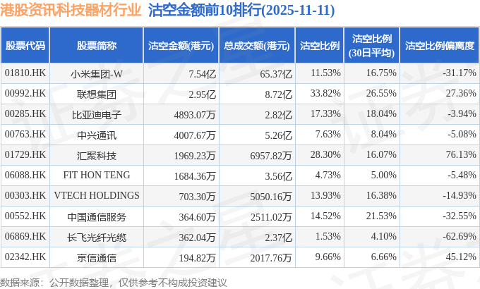 从沽空金额来看,小米集团-W、联想集团、比亚迪电子沽空金额位居行业前三,分别为7.54亿港元、2.95亿港元、4893.07万港元。