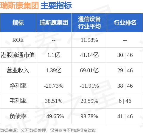 瑞斯康集团港股市值1.1亿港元,在通信设备行业中排名第30。主要指标见下表: