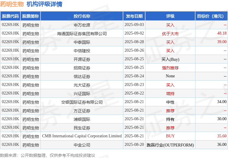 截至2025年11月11日收盘,药明生物(02269.HK)报收于33.24港元,下跌2.69%,成交量2936.11万股,成交额9.78亿港元。投行对该股的评级以买入为主,近90天内共有4家投行给出买入评级,近90天的目标均价为37.13港元。申万宏源最新一份研报给予药明生物买入评级。
