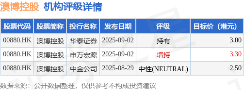 截至2025年11月12日收盘,澳博控股(00880.HK)报收于2.98港元,上涨1.02%,成交量2056.2万股,成交额6134.29万港元。投行对该股的评级以持有为主,近90天内共有1家投行给出持有评级,近90天的目标均价为2.93港元。华泰证券最新一份研报给予澳博控股持有评级,目标价3港元。