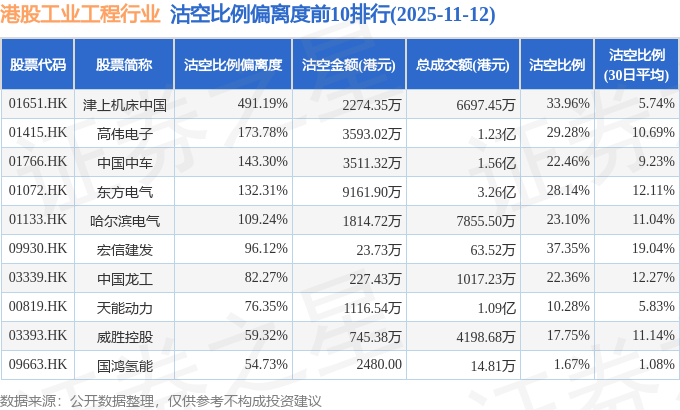 从沽空比例偏离度来看,津上机床中国、高伟电子、中国中车沽空比例偏离度位居行业前三,分别为491.19%、173.78%、143.3%。
