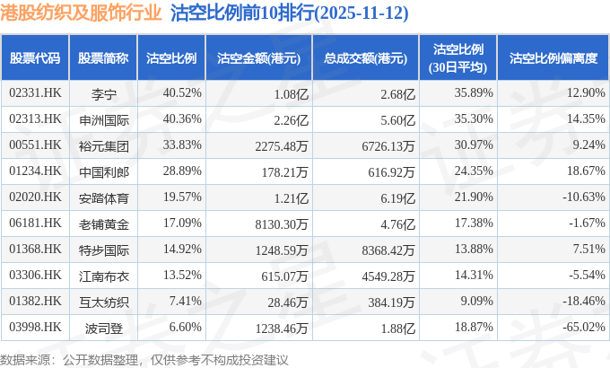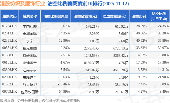 从沽空比例偏离度来看,中国利郎、申洲国际、李宁沽空比例偏离度位居行业前三,分别为18.67%、14.35%、12.9%。