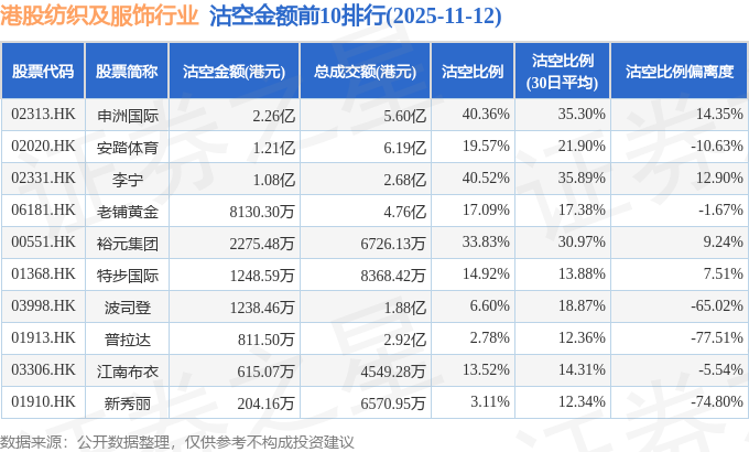 从沽空金额来看,申洲国际、安踏体育、李宁沽空金额位居行业前三,分别为2.26亿港元、1.21亿港元、1.08亿港元。